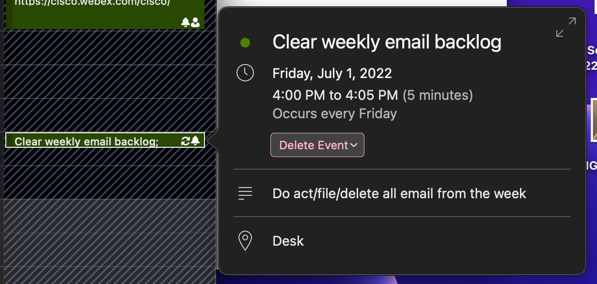 As I mentioned above, when I began this current job, I once again had the fantasy that I could actually do the GTD method. Apart from setting up the mailboxes, I added a 15 minute “meeting” to recur on Fridays at 4:00PM Pacific time. It says: “Clear Email Backlog”